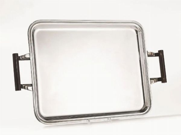 in argento, forma rettangolare, due anse in legno, cm 58,5x36, g 2000