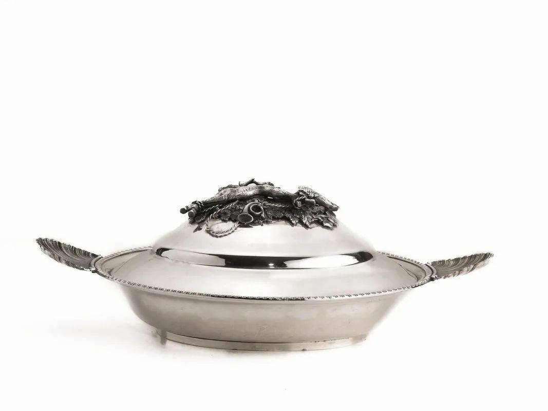 in argento di forma ovale, bordo a cordonetto, due anse modellate come valve di conchiglia, coperchio con finale a trofeo di caccia, cm 43x24, g 1800