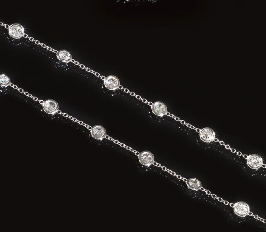 realizzata con una catena a maglia sottile lungo cui si intercalano cinquantatrè brillanti montati entro castone circolare per ct 12 . 61 , g 14