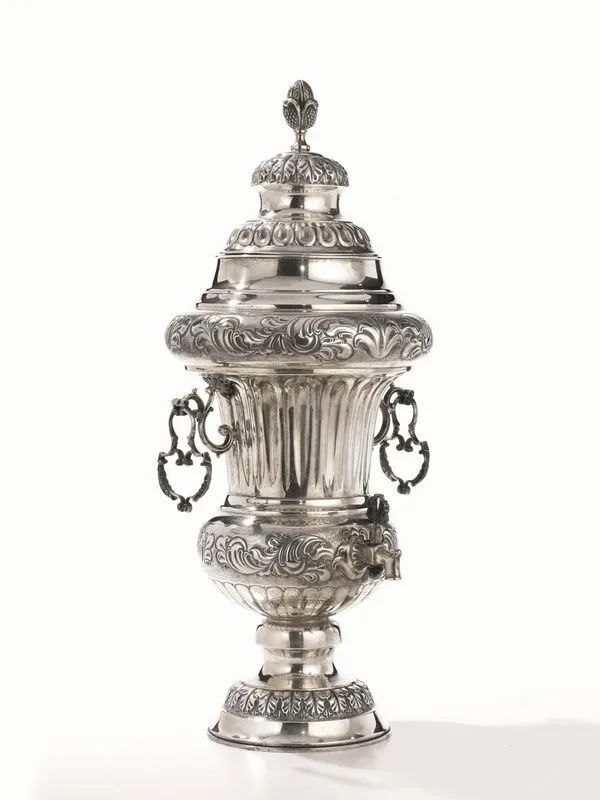 in argento sbalzato a volute di foglie, due anse sagomate, coperchio con finale a pigna, alt. cm 49, g 2260
