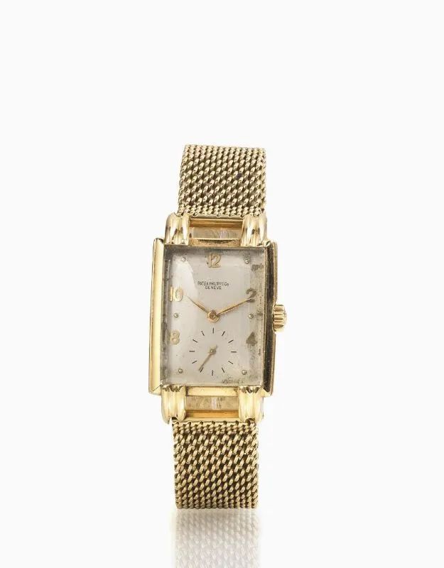 OROLOGIO DA POLSO PATEK PHILIPPE REF. 1480, MOV. N. 836'535, CASSA N. 508'864, ANNI '40, IN ORO GIALLO 18 KT Cassa rettangolare con fondello a scatto, anse curve scanalate. Quadrante argentè con numeri arabi e indici puntiformi applicati, secondi a ore 6, lancette a foglia. Movimento a carica manuale n. 508'864. Bracciale a maglia tessuto in oro giallo 18 kt non pertinente. Dim. mm 40x24