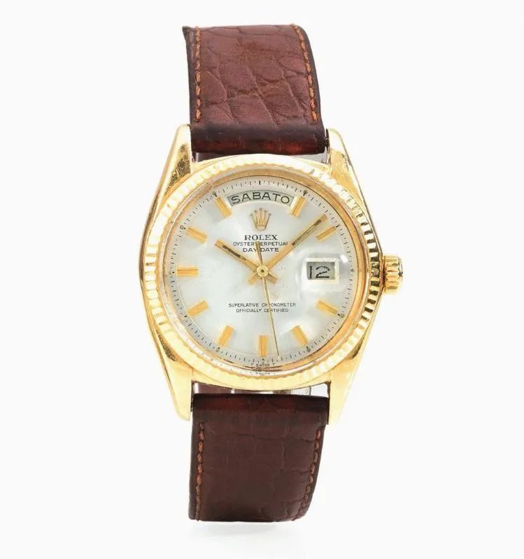 OROLOGIO DA POLSO ROLEX OYSTER PERPETUAL DAY DATE REF. 1803, SERIALE. N. 2'664'239, IN ORO GIALLO 18 KT Cassa in oro giallo in tre corpi con fondello e corona a vite, vetro plastica. Quadrante argentè con indici applicati e lancette a bastone con inserto in materiale luminescente, secondi al centro, datario ad ore 3, finestrella dei giorni in italiano a ore 12. Movimento a carica automatica cal. 1556. Fibbia ad ardiglione Rolex in oro giallo 18 kt. Diam. mm 36