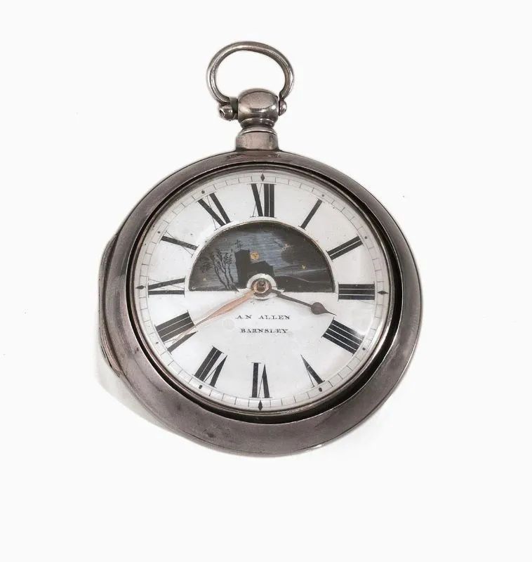 OROLOGIO DA TASCA, ALLEN & BARNSLEY, 1816 CIRCA, IN ARGENTO Doppia cassa in argento liscio, appiccagnolo a ore 12. Quadrante in smalto con numeri romani e apertura per il disco giorno/notte decorata con scene diurna e notturna in policromia, lancette piriforme e a foglia. Movimento con scappamento a verga, carica e rimessa all'ora con chiavetta. Diam mm 62