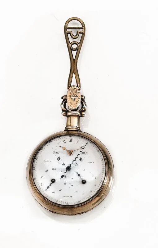 Cassa in argento dorato liscio recante punzoni Londra 1809 e incisione Ralph Gout London 268, leva sagomata e traforata per l'azionamento del contapassi a ore 12 con scudo recante stemma nobiliare. Quadrante in smalto bianco con anello periferico tarato a 100 unità con lancetta a serpentina concentrica, quadrantino delle ore con numeri romani e lancette a foglia e piriforme nella parte superiore, due contatori a 10 e 100 unità con lancetta a serpentina nella parte inferiore. Movimento con scappamento a verga, carica e rimessa delle ore con chiavetta. Diam. mm 55, lungh. cm 13,5