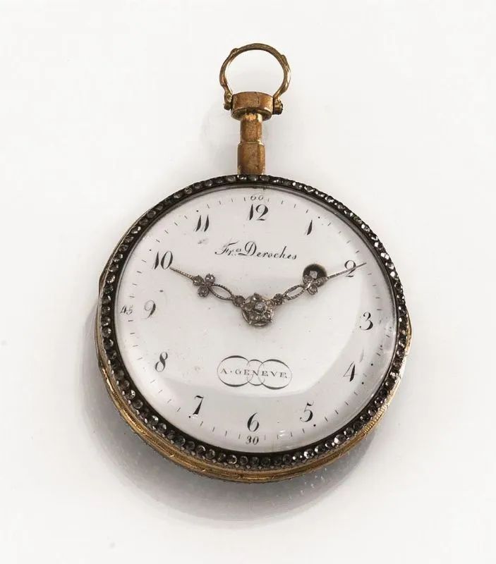OROLOGIO DA TASCA DEROCHES FRERES A GENEVE, 1800 CIRCA, IN OTTONE Cassa in ottone decorata da miniatura policroma raffigurante scena galante e decorazioni floreali in smalto traslucido, lunette posteriore e anteriore in rose di diamante. Quadrante in smalto bianco con numeri arabi, lancette traforate decorate da rose di diamante, alloggio per la chiavetta di carica a ore 2. Movimento con scappamento a verga, carica e rimessa delle ore a chiavetta. Diam. mm 50