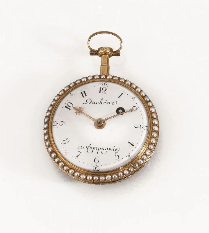 OROLOGIO DA TASCA DUCHENE ET COMPAGNIE, N. 25238, FRANCIA, 1775 CIRCA, IN ORO GIALLO 18 KT, SMALTO E PERLE Cassa in oro giallo interamente decorata in smalto blu e profilata in perle sia sul fronte che sul retro, anello a ore 12. Quadrante in smalto bianco con numeri arabi, lancette ad ago e traforata, apertura per la carica a ore 2. Movimento con scappamento a verga. Diam. mm 44