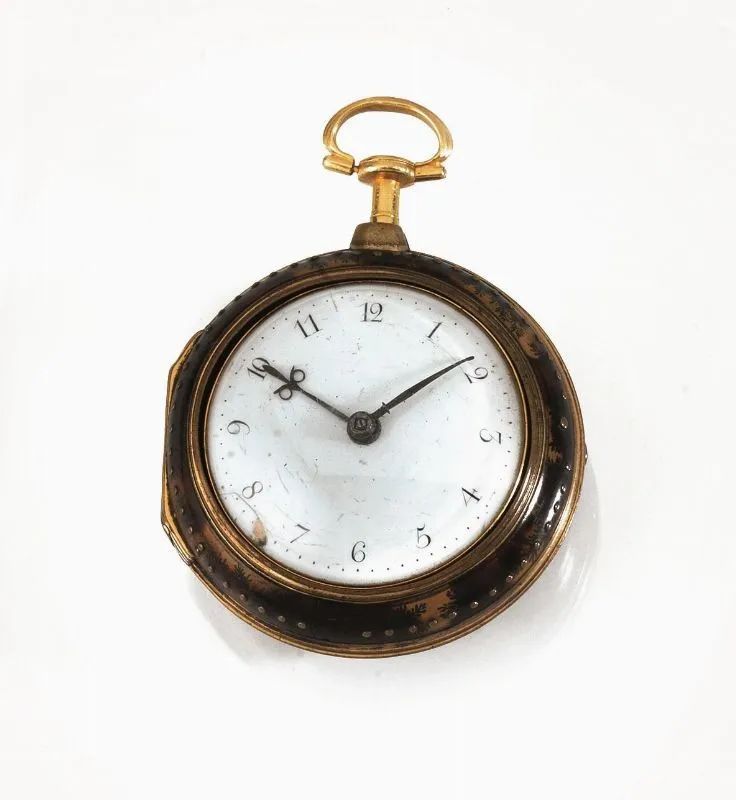 Cassa in ottone liscio, controcassa rivestita in corno profilata da piccole borchie circolari e pitturato a motivi fogliacei, al centro riserva ovale con composizione floreale entro vaso in policromia. Movimento con scappamento a verga, carica e rimessa delle ore a chiavetta. Diam. mm 54