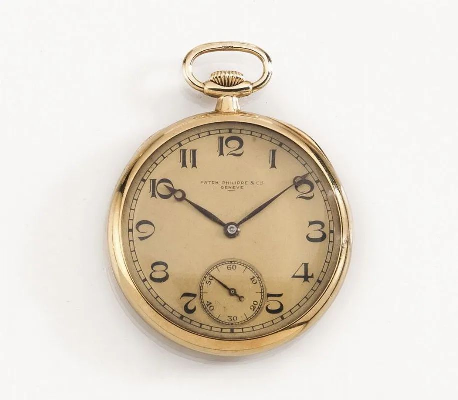 OROLOGIO DA TASCA PATEK PHILIPPE & CO. , MOV. N. 810 ' 202, CASSA N. 289 ' 844 , 1925 CIRCA, IN ORO 18 KT Cassa in oro giallo liscio, corona di carica a ore 12. Quadrante champagne con grandi numeri arabi, secondi a ore 6, lancette traforate. Movimento a carica manuale. Diam. mm 44