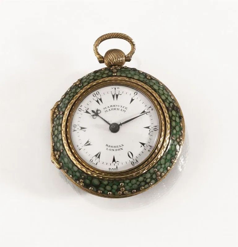 Cassa in ottone dorato liscio, due controcasse di cui quella interna in ottone dorato incisa a motivi floreali e attrezzi da giardinaggio, quella esterna rivestita in zigrino verde e decorata da borchie dorate. Quadrante in smalto bianco con ore in caratteri arabi orientali. Movimento con scappamento a verga con carica e rimessa a chiave. Movimento e quadranti firmati. Diam. mm 52