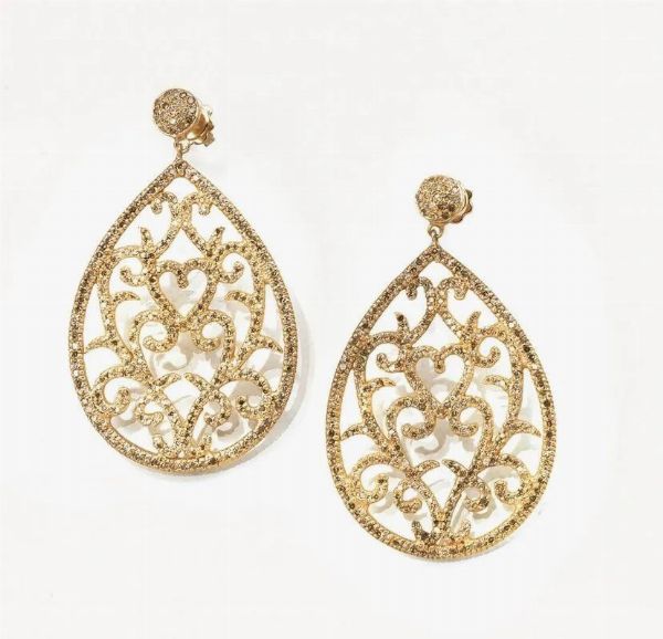 Paio di orecchini pendenti in argento dorato e diamanti ciascuno realizzato con una sferetta decorata in brillanti a cui è sospesa una goccia traforata ad arabeschi analogamente decorata per ct 3.50, farfallina in oro rosa 750, g 17