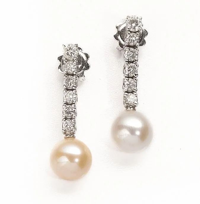 Paio di orecchini pendenti in oro bianco, diamanti e perle ciascuno realizzato ad una fila di sei brillanti montati a griffe, con finale pendente una perla bianca e una perla color crema diam. mm 9, g 5