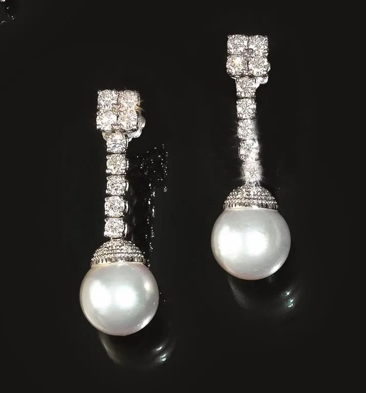 Paio di orecchini pendenti in oro bianco e diamanti realizzato ad una fila di brillanti sospesi ad un elemento quadrato con finale una perla diam. mm 13 decorata nella parte superiore da una coppiglia, punzone 750, g 15