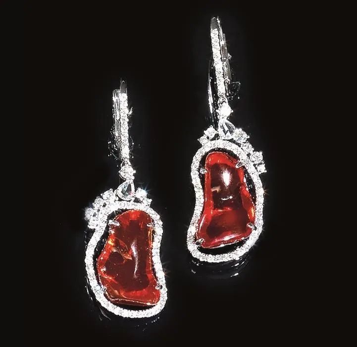 Paio di orecchini pendenti in oro bianco, opali di fuoco e diamanti