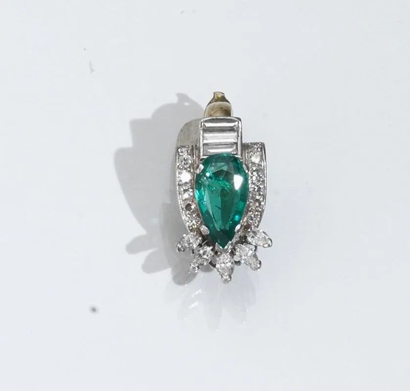 di forma sagomata con smeraldo a goccia contornato da brillanti marquise, taglio singolo e bagu ette, g 7