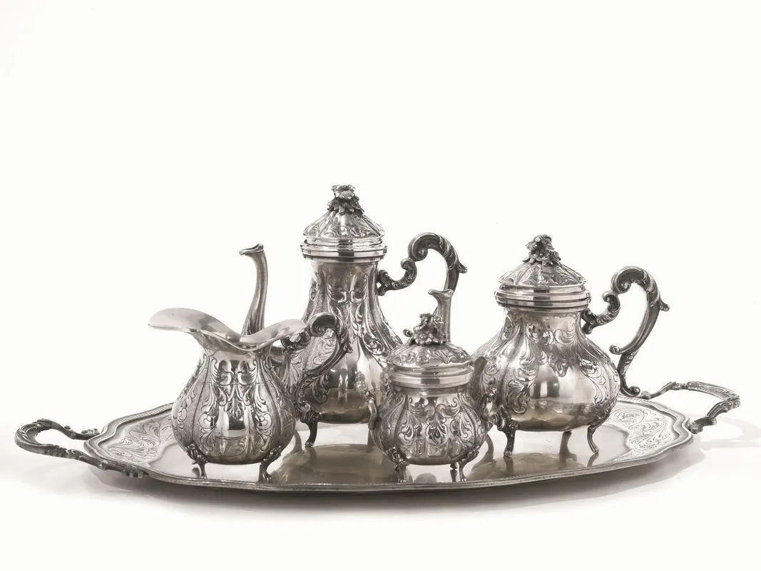 in argento sbalzato a costolonature ed inciso a motivi fogliacei, finali dei coperchi realizzati come boccioli, composto di teiera, caffettiera, zuccheriera, lattiera e guantiera, g 6390 (5)
