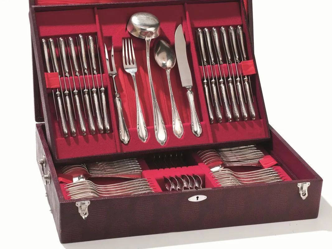 Composizione: 12 forchette, 12 coltelli, 12 cucchiai, 12 forchette e 12 coltelli da frutta, 12 cucchiaini da tè, 1 ramaiolo, 1 coltellone e 1 forchettone, 2 posate da portata