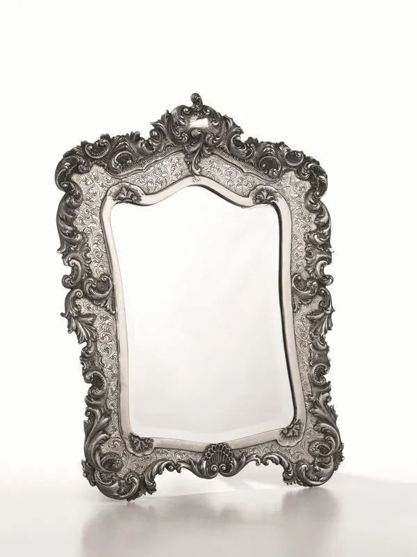 cornice in argento riccamente sbalzato e cesellato a volute di foglie, cm 55x41