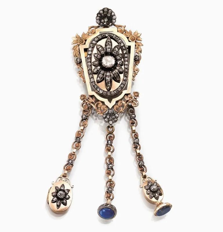 Spilla pendente, in oro rosa, argento e diamanti parte di un devant de corsage in oro rosa cesellato a forma di scudo traforato con corolla in rose di diamante, interamente decorato da motivi fogliacei, nella parte inferiore tre catenelle pendenti con finali un portaricordi e due lapislazzuli, g 33