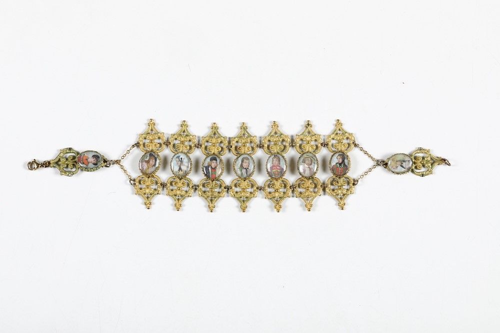 Braccialetto. Metallo fuso, traforato, cesellato, dorato e smalti dipinti. Svizzera [..]
