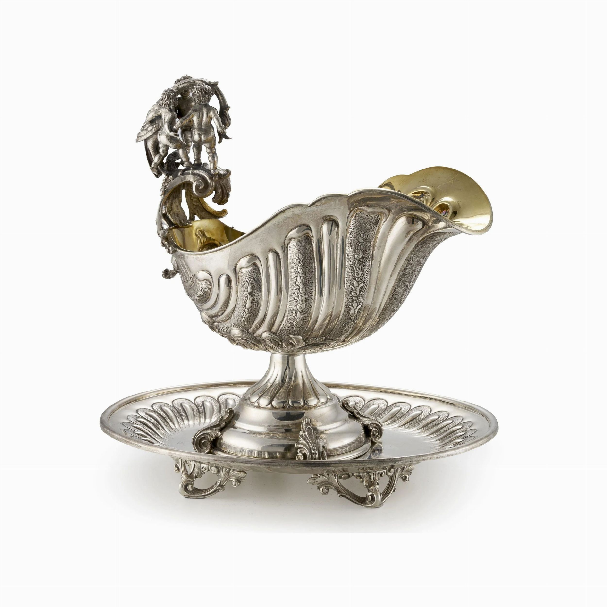 GRANDE SALSIERA, MILANO, SECOLO XX in argento in forma di grande valva con ansa realizzata come una foglia su cui giocano dei putti a tutto tondo, vassoietto ovale poggiante su quattro piedini a voluta, salsiera cm 23x10x24, vassoio 25x21, complessivi g 1595.