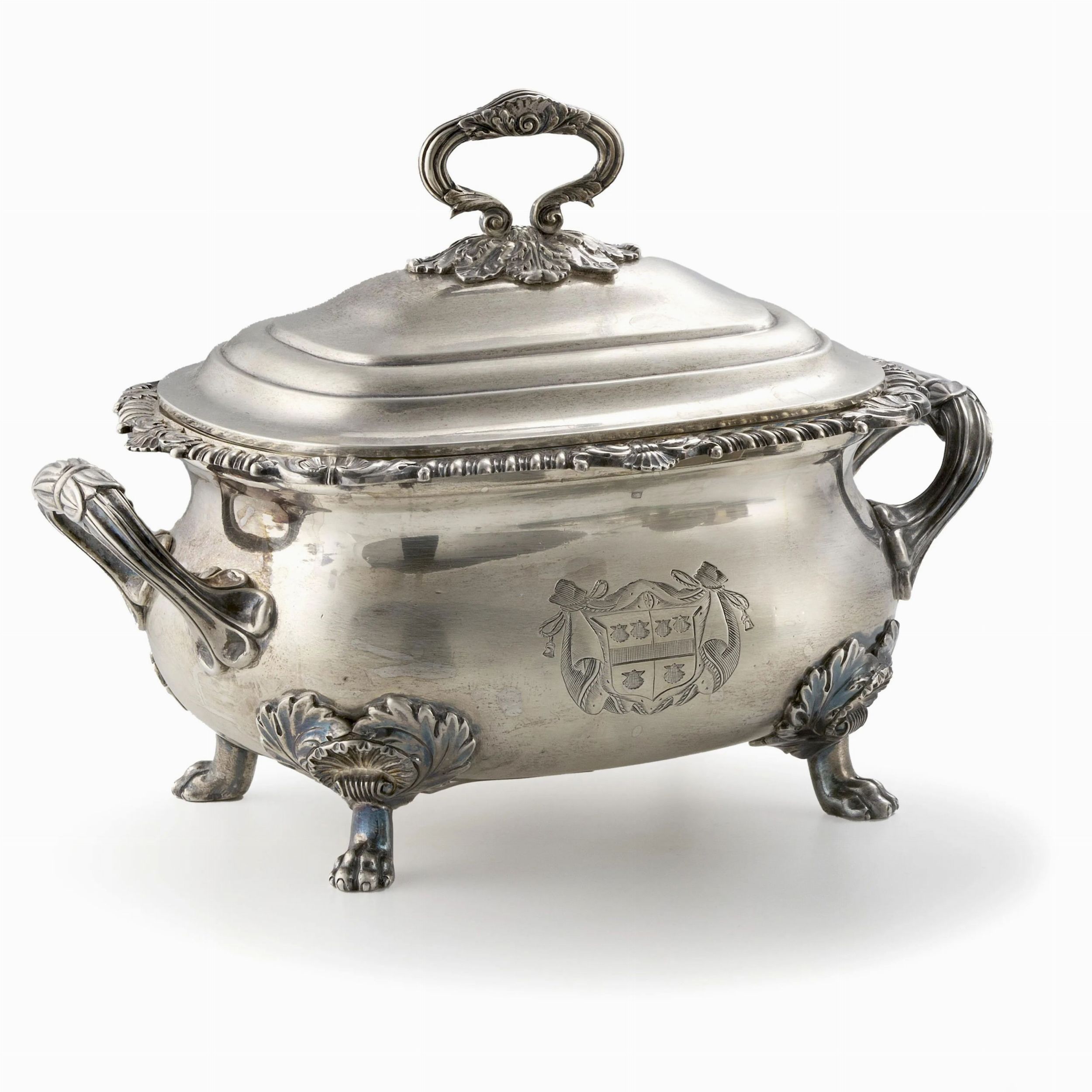 PICCOLA ZUPPIERA, LONDRA, 1814, ARGENTIERE WILLIAM EATON in argento di forma rettangolare poggiante su quattro piedini terminanti a zampa ferina, fronte con stemma nobiliare inciso, presa del coperchio a volute contrapposte, cm 21x13,5, g 1045