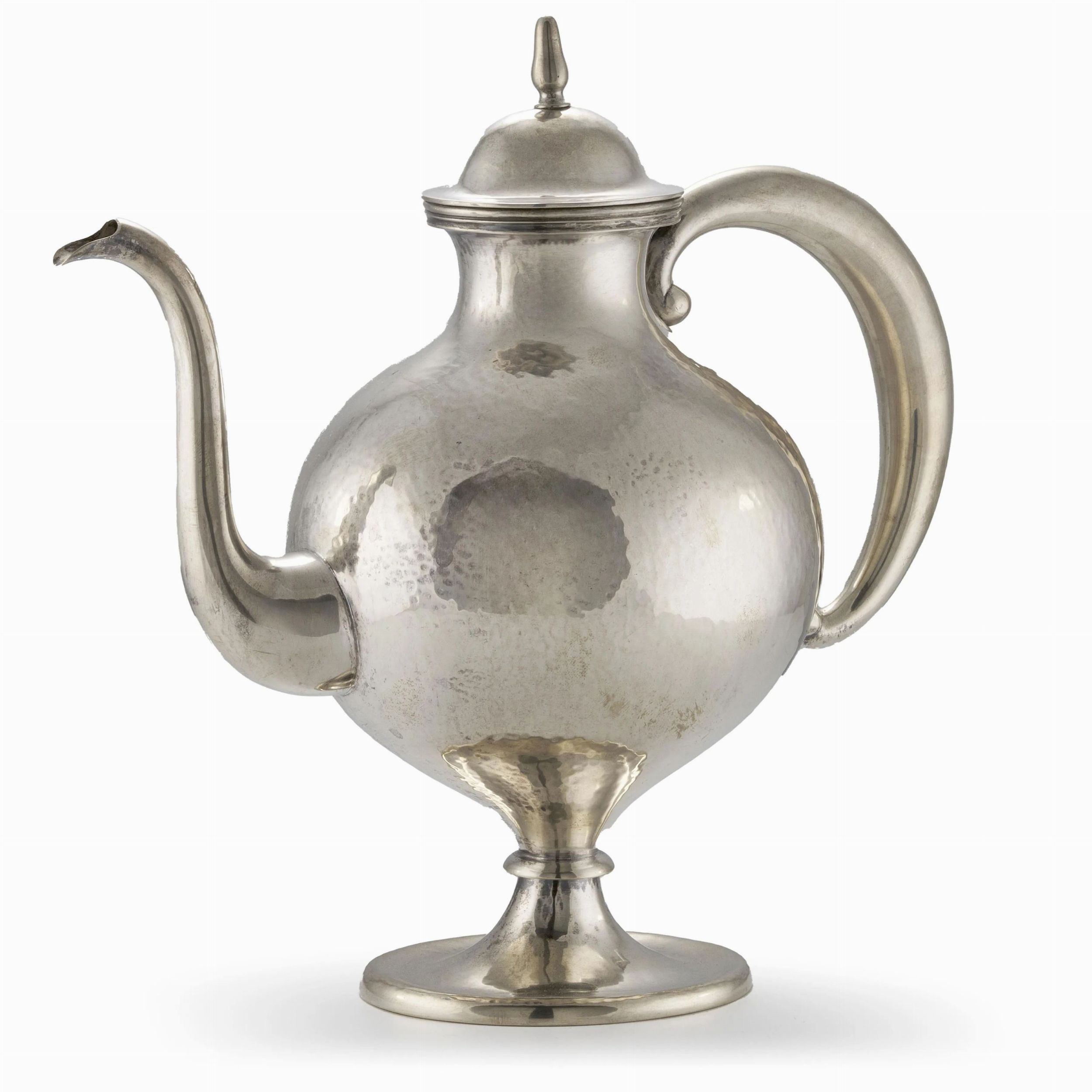 in argento martellato, corpo sferico, presa e beccuccio a voluta in argento liscio, alt. cm 27, g 950