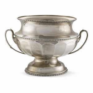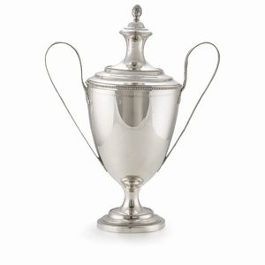 COPPA A DUE MANICI, AMSTERDAM, SECOLO XIX in argento, base circolare gradinara, due anse a volute, coperchio [..]