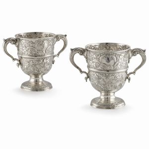 COPPIA DI COPPE BIANSATE, SECOLO XIX in argento sbalzato a fiori, anse a doppia voluta, alt. cm 13,5, complessivi [..]