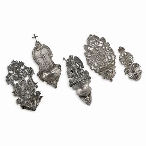 CINQUE ACQUASANTIERE, SECOLI XIX-XX in argento, alt. cm 22, cm 20, cm 19, cm 18, 5 e cm 14, complessivi g 550 [..]