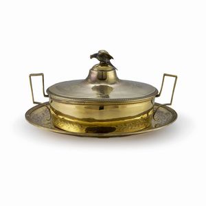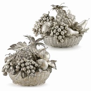 DUE CESTI, SECOLO XX in argento con coperchi reallizzati a frutti a tutto tondo, diam. cm 32, g 3900 [..]