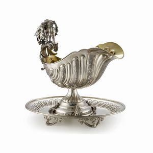 GRANDE SALSIERA, MILANO, SECOLO XX in argento in forma di grande valva con ansa realizzata come una foglia su [..]
