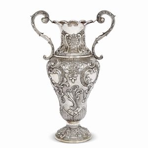COPPIA DI COPPE BIANSATE, SECOLO XIX in argento sbalzato a fiori, anse a doppia voluta, alt. cm 13,5, complessivi [..]