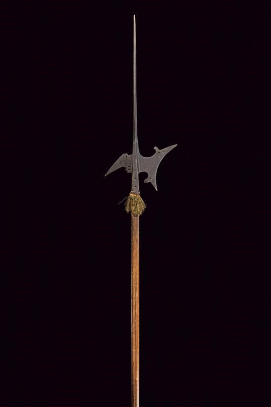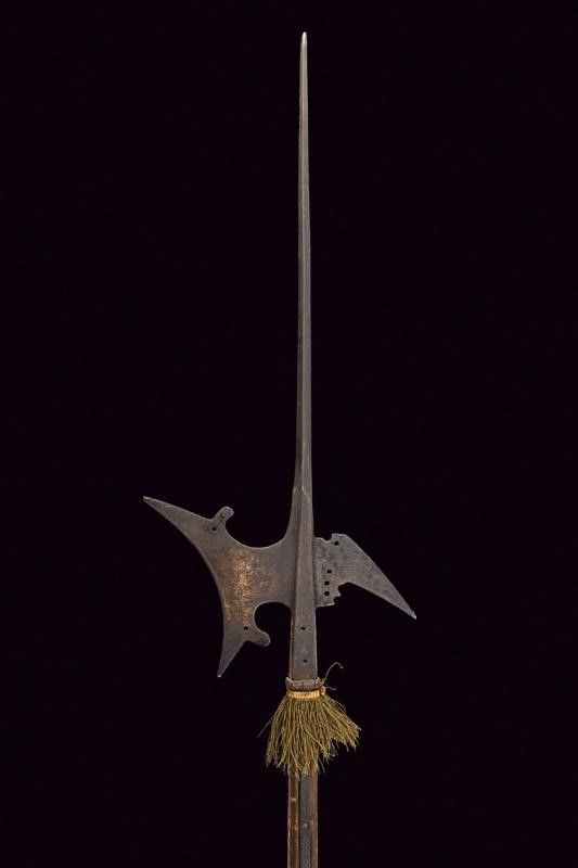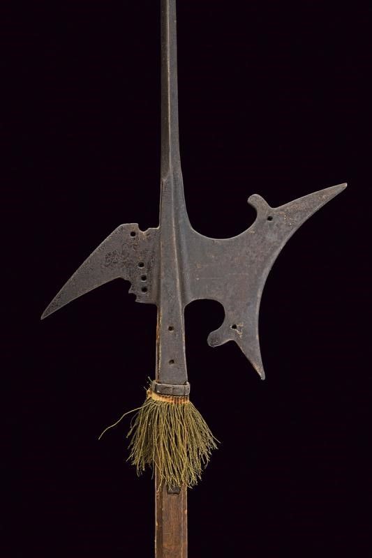 lunghezza 244 cm. Scure con taglio incavato, munita di due gobbe sul dorso traforate alla base, becco obliquo con base traforata, lunga cuspide di sezione romboidale. Resti di bandelle piatte. Su fusto ottagonale in legno decorato con una nappa in canutiglia dorata.