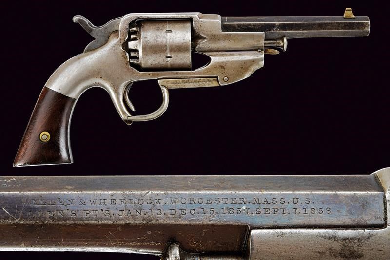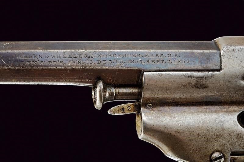 USA, lunghezza 25 cm. 1861 - 1862 Canna ottagonale rigata da 5', con marcatura standard sul fianco sinistro ben visibile, cal. 36. Anima con qualche intaccatura, rigatura visibile. Tamburo liscio a sei colpi. Meccanicca funzionante. Leva del calcatoio al ponticello. Qualche intaccatura. All'interno dell'impugnatura e in altri punti la matricola '422' (in questo modello non è certo che si tratti di una matricola, potrebbe essere numero di assemblaggio). Guancette in legno. La canna conserva il 70% di brunitura antica.