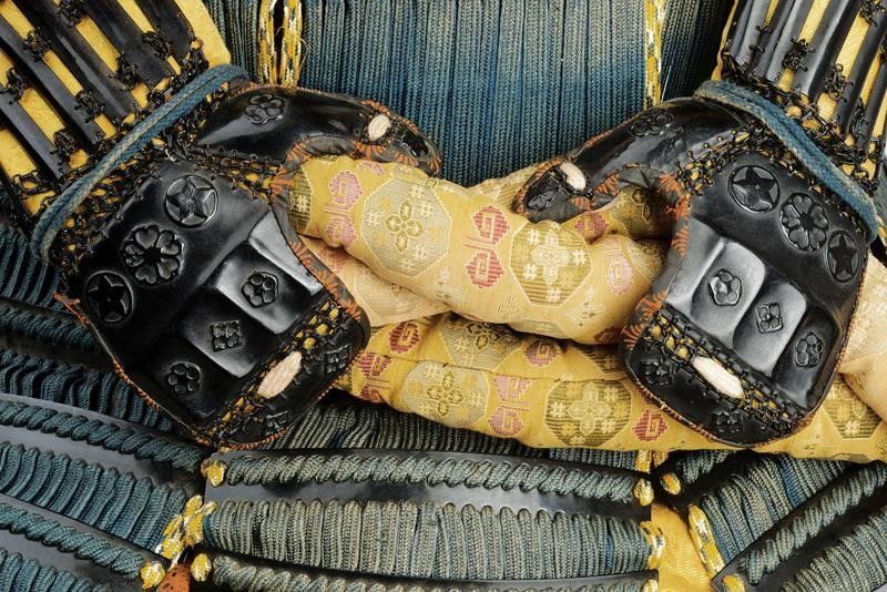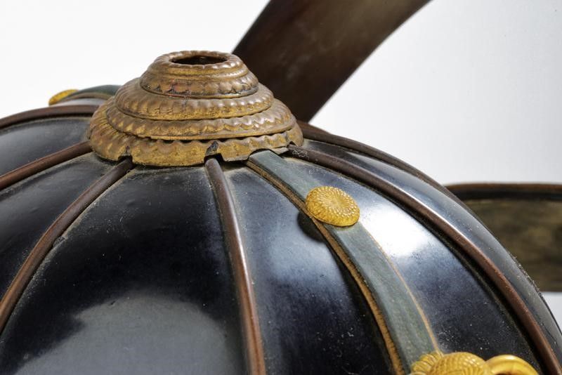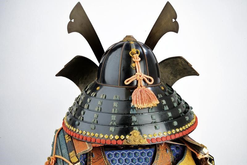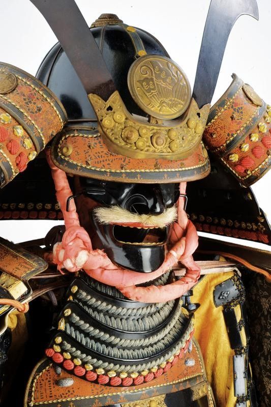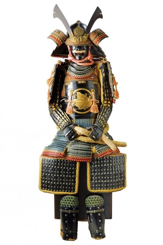 altezza as shown circa 165 cm. Periodo Showa (1926-1989) Realizzazione di qualità. Con Kabuto dotato di Hachi in ferro a otto piastre, con Tehen-kanomono al sommo. Mabizashi e fuki-gaeshi con rivestimento in cuoio dipinto, dotato di Maedate e Mon in ottone. Ressei-menpo con mustacchi sbiancati. Do in ferro con decoro in oro ed elementi in cuoio dipinto en suite con l'elmo. L'armatura è munita di Sode, Kote, Haidate e Suneate. Maedate, fukigaeshi e Do tutti en suite con lo Cho-mon (farfalla). Completa di gusku-bitsu. Manichino non incluso.