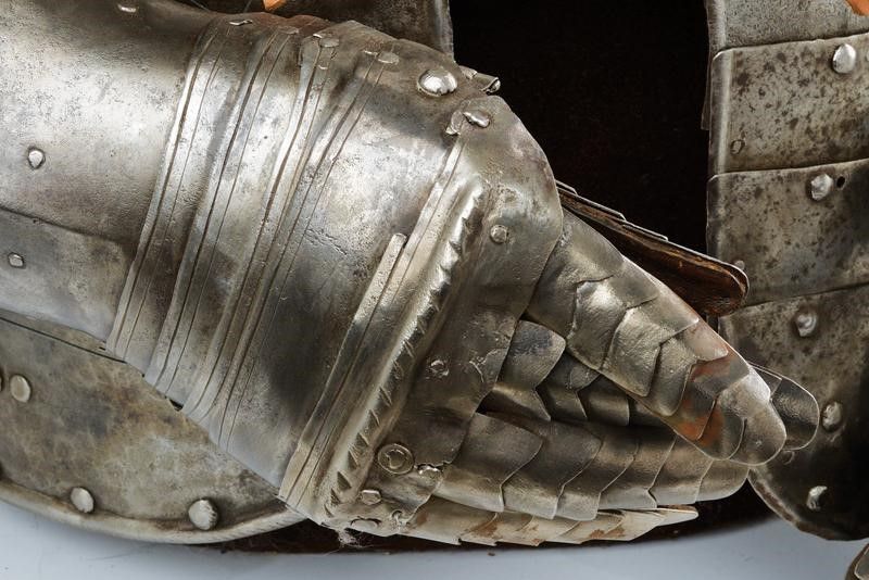 Goletta a due lame, dotata di ribattini con testa in ottone, lo scollo con sottile cordone lavorato a fingere il tortiglione. Spallacci asimmetrici a otto lame, con bordi orlati lavorati a tacche, ribattini in ottone, i margini esterni cordonati, le lame principali ornate con nervature a spirali. Petto in ferro (restauri), fortemente costolato in mezzeria, dotato sul fianco destro di fori per una resta; lo scollo recante uno spesso cordone i giri ascellari lisci; munito di panziera. Scarselle a quattro lame, tenute da fibbie e coietti. Bracciali tenuti da chiodi a voltare, muniti di cubitiere con bordi orlati e lavorati a tacche, antibracci apribili in due parti. Manopole con manichini appuntiti e costolati e margini a lista ribassata, i dorsi e le dita a scaglie.