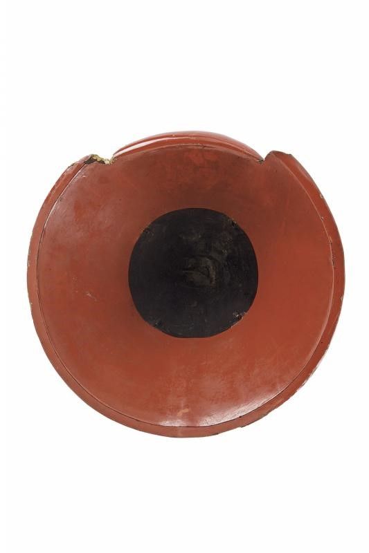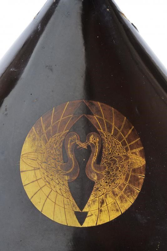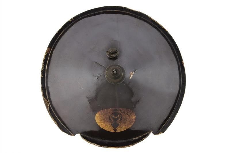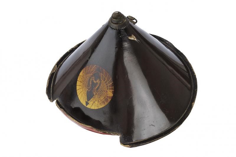 altezza 20 cm. Periodo Edo (1603-1867) In leggera struttura kanshitsu laccata in nero, al sommo hachimanza, sul lato frontale il Mukai-tsuru-mon in oro. Il bordo con mancanze. L'interno laccato rosso. Questo tipo di Jingasa era chiamato appositamente Tonkyobo in giapponese. I Tonkyobo erano indossati da tutte le classi Samurai del nuovo esercito governativo (Satsuma e Choshu) dalla classe più alta fino al soldato di fanteria. Era comunemente usato dalle truppe Ashigaru Teppo-tai (tiratori di Tanegashima). Probabilmente, vista l'alta qualità, questo esemplare venne utilizzato da un comandante di truppe Ashigaru Teppo-tai. Fine del periodo Edo, 1860 circa.