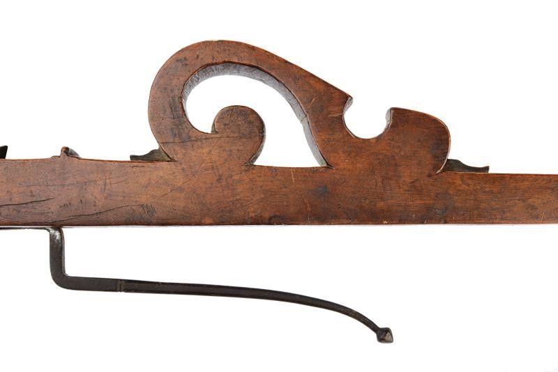Teniere in legno di forma arcuata nella sezione anteriore, con fornimenti in ferro. Arco controcurvato di sezione rettangolare. Visiera intagliata a spire. Al dorso decorazione traforata. Piccolo pomo a disco.