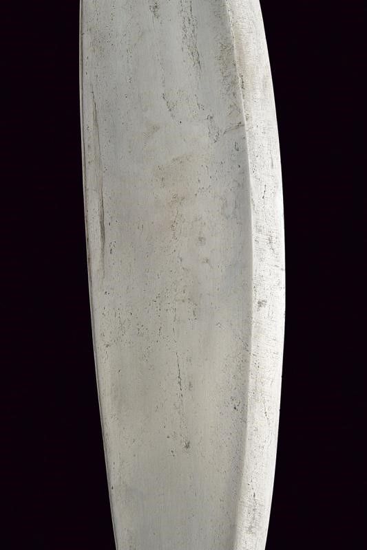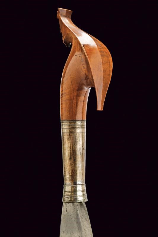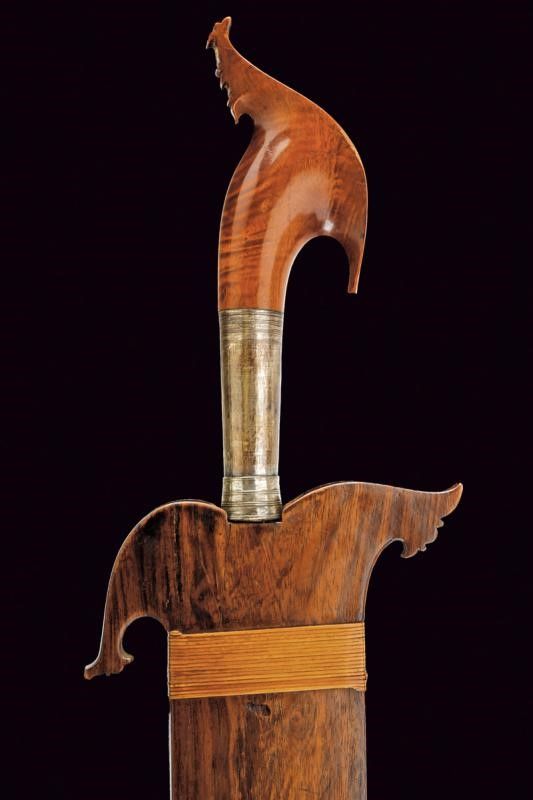 Filippine, lunghezza 59 cm. Fine del XIX Secolo Robusta lama a foglia con un filo. Fornimento in legno scolpito, con impugnatura rivestita da lamina d'argento decorata ad anellature incise. Fodero in legno intagliato, in due pezzi tenuti da bande in rattan.