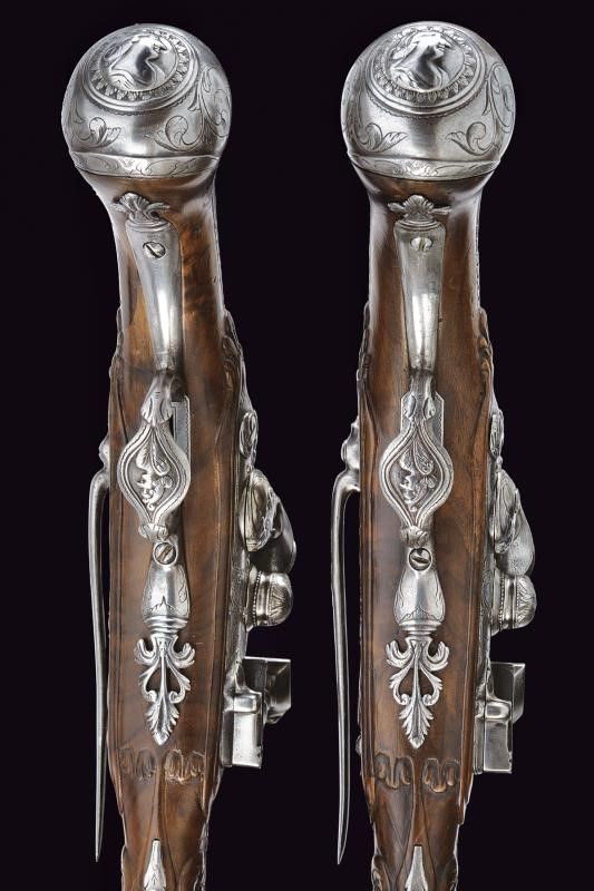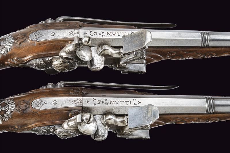 Canne lisce a due ordini; la prima parte ottagonale firmata 'G. MUTTI' fra trifogli, la seconda parte tonda, con anellature al cambio, in calibro 12 mm. in volata; codette incise. Bellissime batterie alla fiorentina con cartella tonda incisa con busto femminile fra rami e testa di serpente, la coda intagliata recante busto intagliato, il cane con maschera grottesca, la martellina intagliata a motivi floreali, le viti con mascheroni, i copriscodellini decorati con pesce stilizzato. Casse intere in legno (piccoli restauri) scolpiti a motivi floreali in bassorilievo. Fornimenti in ferro, intagliati, incisi e parzialmente traforati, recanti busti e fiorami. Ganci da cintura. Bacchette in legno con battipalla e cavastracci in ferro.