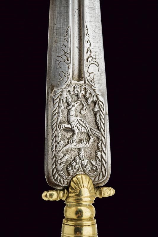 lunghezza 27,5 cm. Lama dritta a due fili, sgusciata al centro, recante al tallone effigi di animali in bassorilievo: su una faccia un leone, sull'altra un volatile esotico, entrambi entro cornicette e con foglie in rilievo. Elso, nodo, e ghiera in metallo bianco. Impugnatura tortile in dischi di corno chiaro e scuro alternati, e dotata di avvolgimento di trecciola in rame. Cappetta ornato a petali in rilievo. Fodero in legno con rivestimento di velluto (liso) e dotato di fornimenti in ottone.