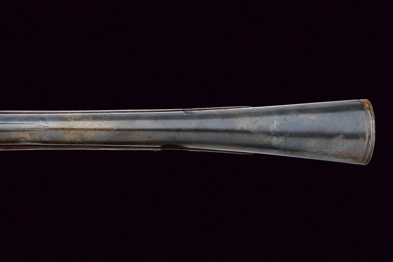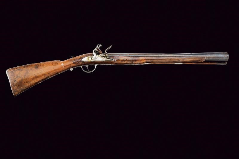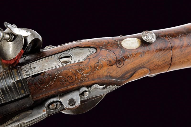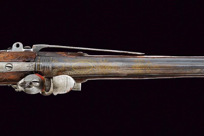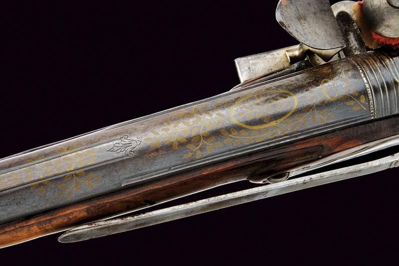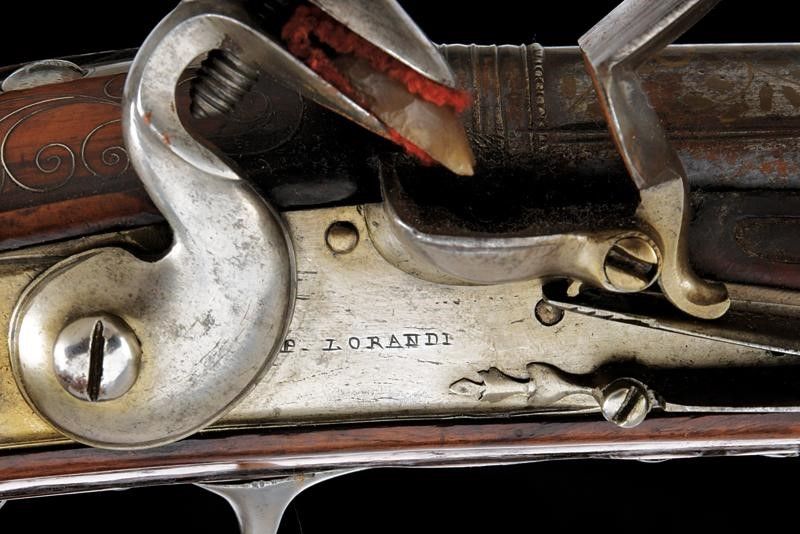 lunghezza 87.5 cm. Bella canna liscia tonda, con base quadra; la prima parte con varie cornici e breve bindella, decorata a motivi floreali rimessi in ottone su fondo brunito, la volata con forte strombatura ellittica e decorata ad anellature. Codetta incisa. Batteria a pietra focaia firmata 'P. LORANDI'. Bella cassa in due pezzi in radica con calcio pieghevole, piccoli difetti; l'area intorno alla codetta decorata in filigrana, il bottone per lo sgancio del calcio in ferro intagliato a fiore, al dorso placca ovale in madreperla. Fornimenti e gancio da cintura in ferro parzialmente intagliati a motivi floreali. Bacchetta in legno con battipalla in corno e cavastracci in ferro.