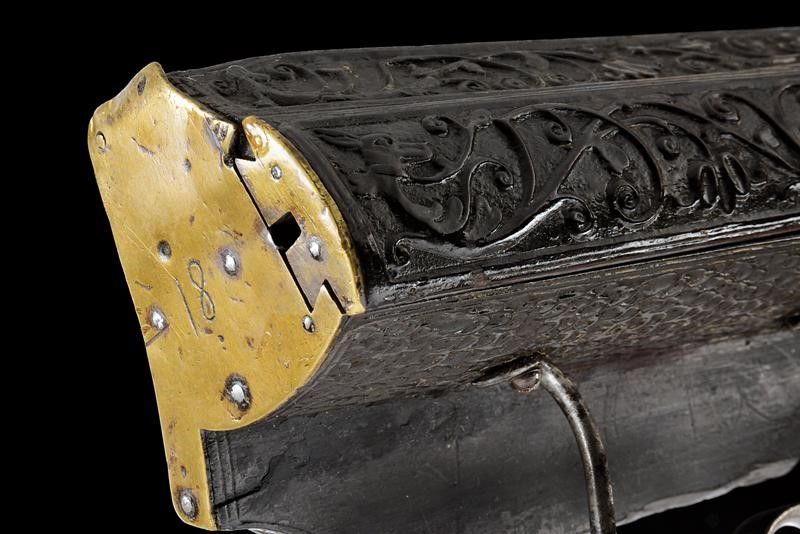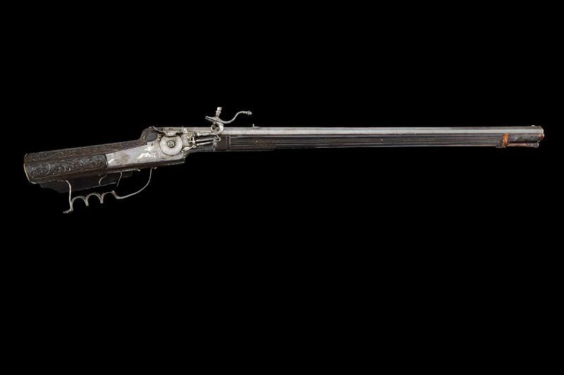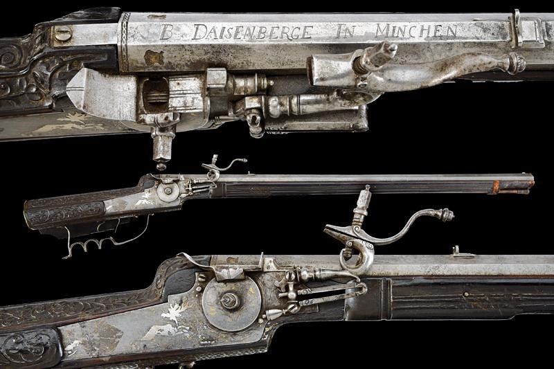 Canna ottagonale, rigata, firmata alla base 'B. DAISENBERGE IN MINCHEN', sui lati due punzoni, cornici alle estremità, mirino in argento, cal. 14 mm. Batteria a ruota parzialmente incassata; la copertura liscia e, come anche la cartella, con resti di decorazioni in argento; la molla e il cane intagliati, il copriscodellino scorrevole, il focone foderato. Cassa intera in legno, riccamente intagliata in rilievo con animali fra volute nella parte posteriore, la guancia sinistra con leone, grifone, segugio, cervo e lepre; l'astina con scanalature. Dotata di patchbox. Ponticello in ferro di forma anatomica e con piccola conchiglia alla coda. Grilletto e stecher (funzionante). Calciolo in ottone, marcato con il numero '18'. Piccoli restauri e mancanze. Bacchetta in legno con restauri. Raro.