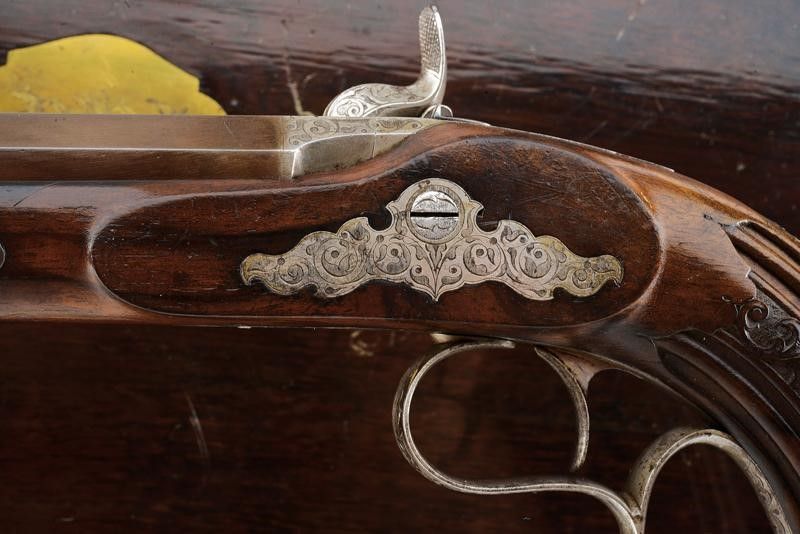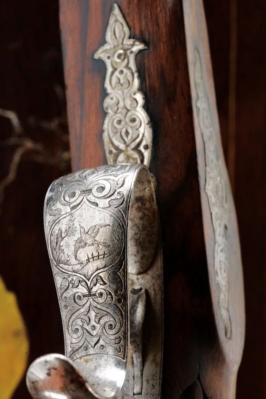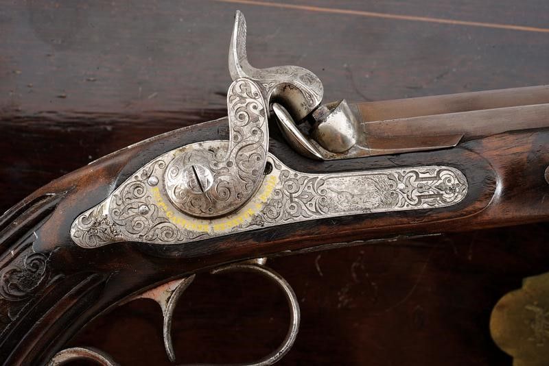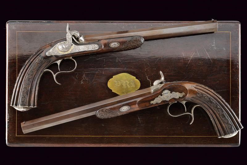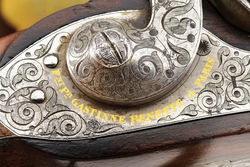 Canne rigate (anima pulita, qualche piccolissima intaccatura, le rigature ben visibili), ottagonali, brunite, firmate in oro (lievi mancanze) 'F.NI PAR GASTINNE RENETTE A PARIS', finemente incise a volute alla base, dotate di mirino di precisione, cal. 12.3 mm. Codette incise en suite e munite di alzo. Belle batterie a luminello a molla in avanti, cartelle piatte totalmente incise, recanti un uccello, un segugio, volute e decorazioni floreali; anche il cane completamente inciso. Le cartelle firmate in oro 'F.NI P.R GASTINNE RENETTE A PARIS, con code ribassate. Casse a tre quarti in legno scolpito; i calci scanalati e con racemi che si ripetono anche al muso. Fornimenti in acciaio incisi en suite alla batterie, ponticelli con poggiadito. I grilletti pur non avendo lo stecher si presentano con una sensibilità elevatissima. Nella loro cassetta originale in legno (piccoli difetti), con coperchio recante il monogramma 'PRI'; l'interno rivestito in velluto marrone. Dotazione completa di tutti gli attrezzi fra i quali, una piccola fiasca da polvere, il fondipalle, un cacciavite, un martello in legno, bacchette e la chiave per la serratura. Di buona fattura.