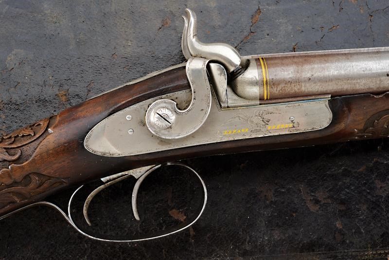 Canne lisce (anima pulita), tonde, in damasco, brunite, con bindella marcata in oro 'Damas Tres Fin', base recante cornici in oro, mirino, calibro 18 mm in volata. Codetta incisa, munita di traguardo e parascintille. Batterie a molla in avanti, cartelle firmate 'LEPAGE FRERES' e 'A PARIS' in oro, le marcature sormontate da un'aquila con saette, i bordi incisi con ghirlanda. Mezza cassa in legno (piccolo difetto al calcio) finemente scolpita a motivi floreali e con fornimenti in ferro brunito, con bordi incisi en suite. Bacchetta in legno con cavastracci in ferro e battipalla in ottone. In cassetta di legno rivestita di cuoio (mancanze) e foderata all'interno con velluto color blu, munita di vari attrezzi e di due fiasche (una per i pallini e una per la polvere). Chiave mancante.