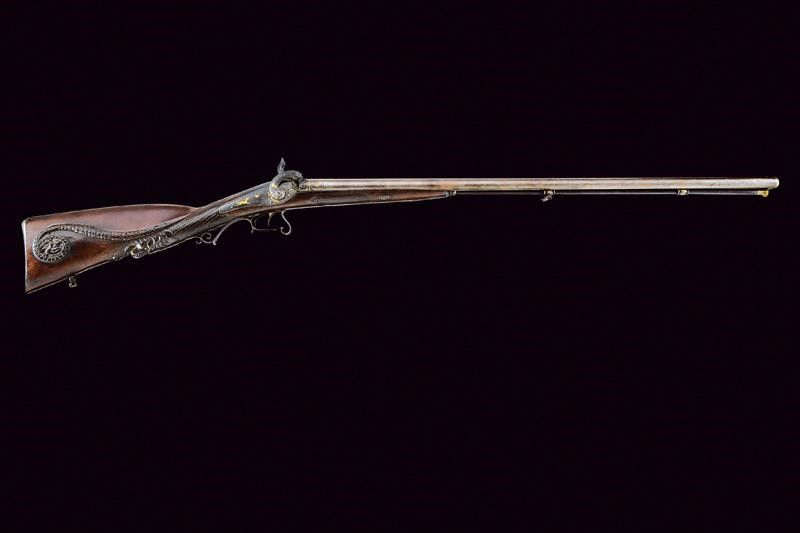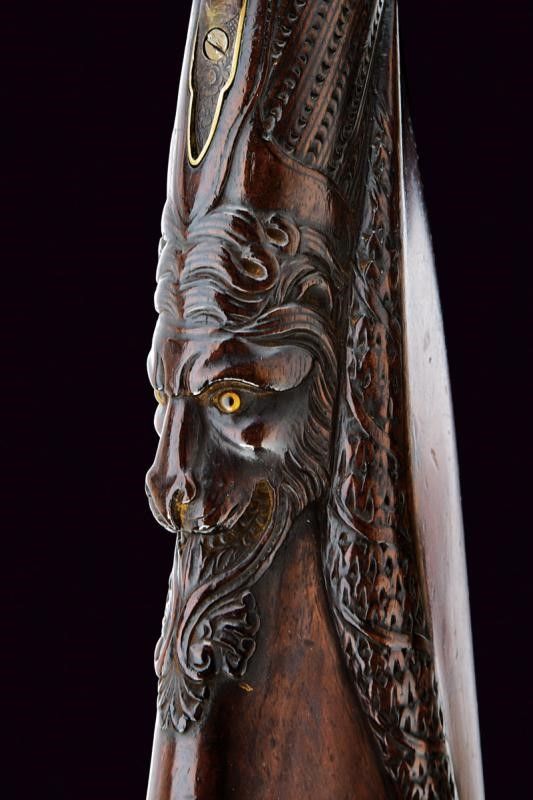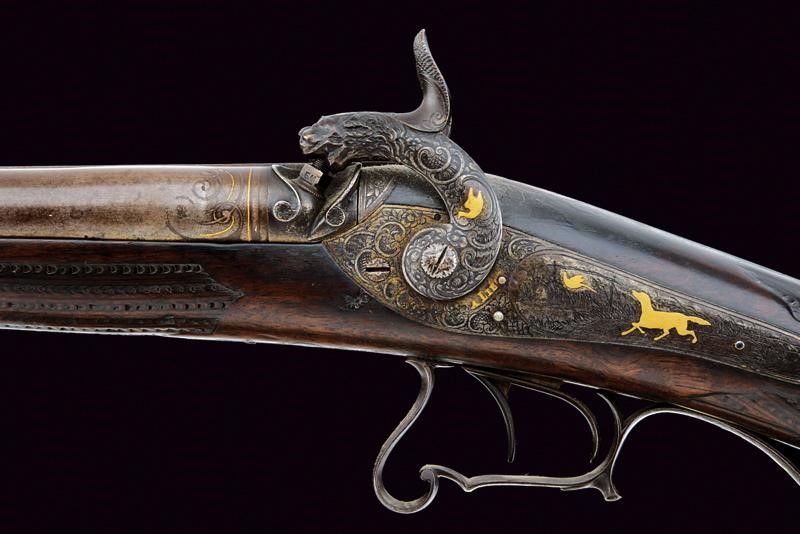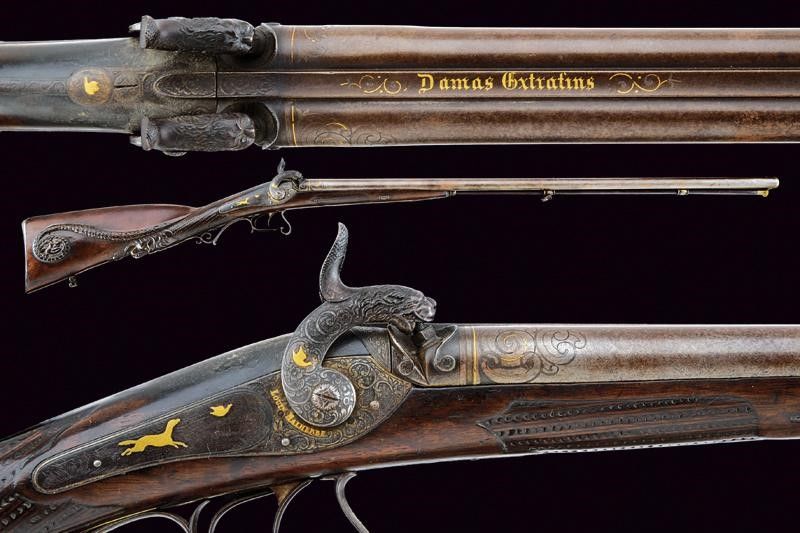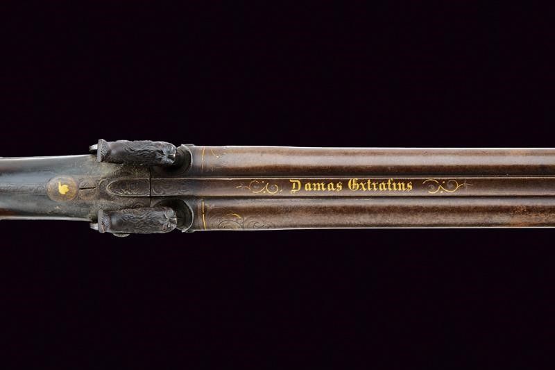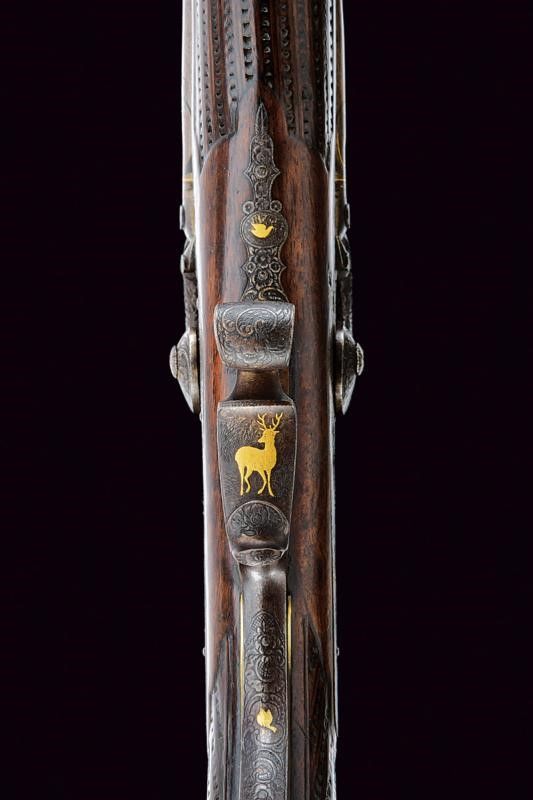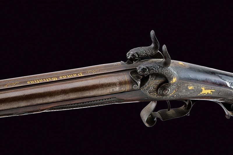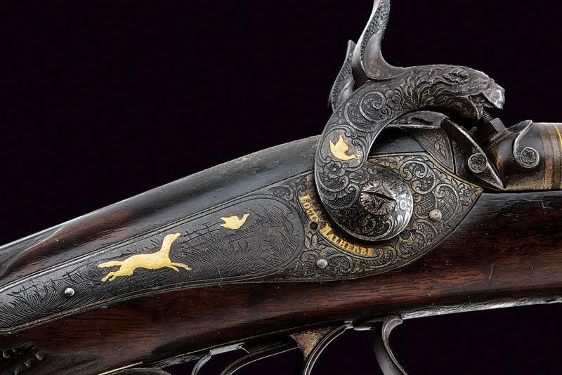 Canne lisce, tonde in damasco, la base decorata con incisioni a racemi (resti di doratura), bindella con marcatura in oro 'Damas Extrafins', mirino in argento, calibro 16 mm in volata. Bellissime batterie a molla indietro con cartelle finemente incise a motivi floreali e con scena di un segugio intento a rincorrere un volatile in un campo di grano (i due animali rimessi in oro, il secondo presente anche sui cani); firmate 'LOUIS MALHERBE A LIEGE'; interessanti cani intagliati a testa di leone e totalmente incisi a motivi floreali. Mezza cassa in legno con calcio scolpito a testa di leone, dal quale partono due elementi in rilievo, uno culminante in un volatile scolpito, l'altro nel patch-box in ottone raffigurante un lupo in rilievo. Fornimenti in ferro totalmente incisi en suite alle batterie, il ponticello con cervo e due volatili rimessi in oro. Bacchetta in legno con battipalla in ottone e cavstracci in ferro. Di buona qualità.