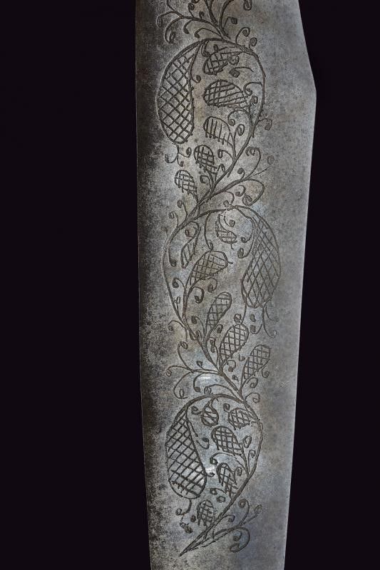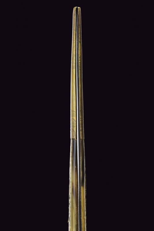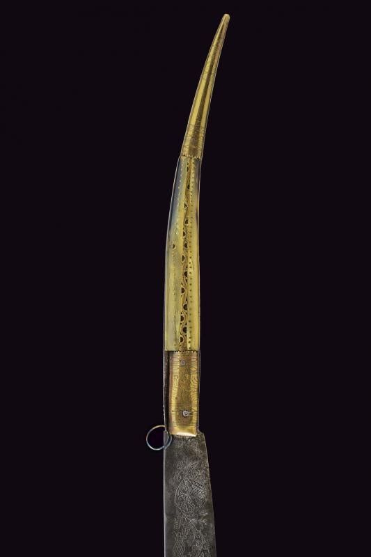 lunghezza open 77.5 cm. Larga lama con punta incavata a un filo, il lato di terza inciso a motivi floreali. Bella impugnatura in ottone inciso, con guancette in corno decorate a chiodini in ottone. Sul dorso lunga molla in ferro (l'anello di ricambio).