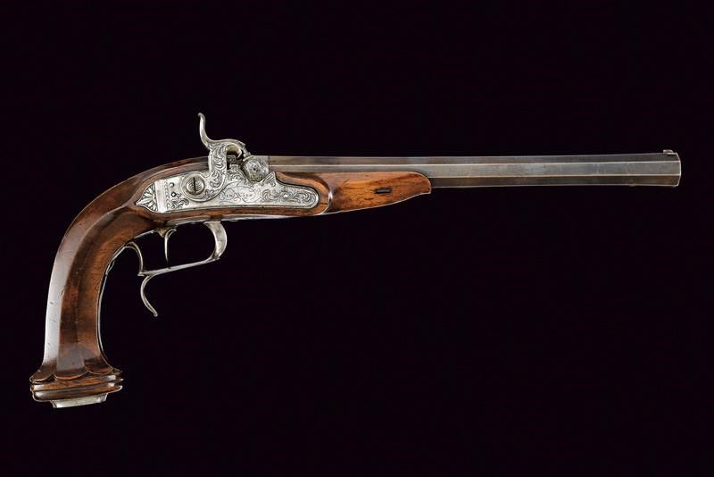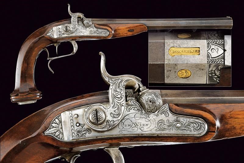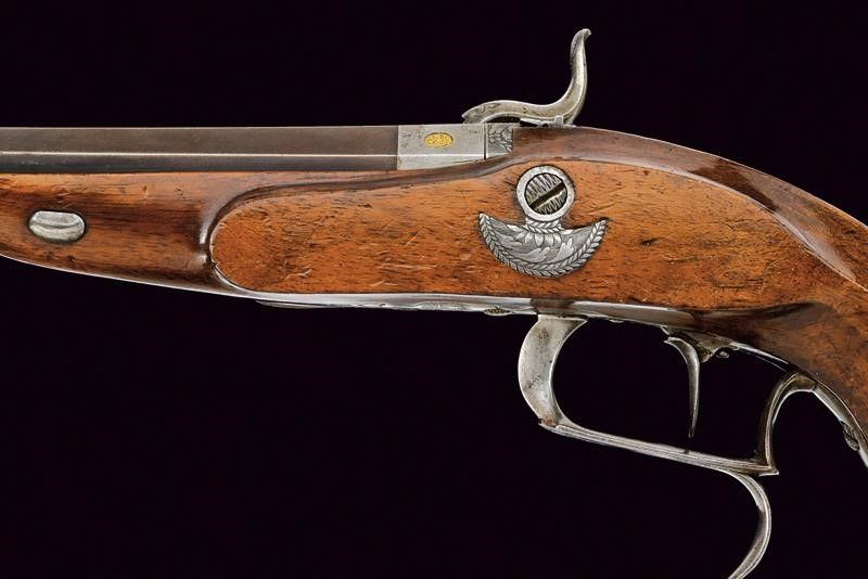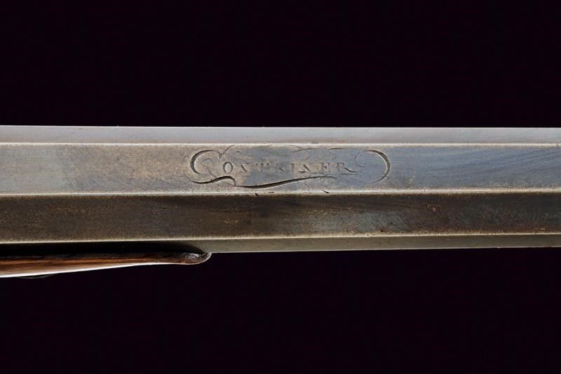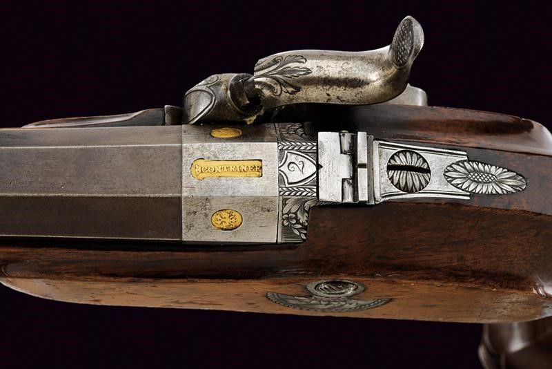 lunghezza 42 cm. Canna ottagonale rigata, (anima con pitting, rigature visibili), brunita; la base con marca 'CONTRINER' e due punzoni imperiali rimessi in ottone, al centro firma 'CONTRINER', la volata strombata e munita di mirino di precisione, cal. 12.5 mm. Corta codetta finemente incisa e munita di doppio alzo e numero '2'. Batteria a molla in avanti con cartella marcata 'IN WIEN' e finemente incisa a motivi floreali, la base del pistone con danni da ruggine. Mezza cassa in legno con calcio faccettato e base ellittica. Fornimenti in ferro incisi en suite. Ponticello con poggiadito. Stecher da aggiustare. Pistola da cassetta, quindi priva di alloggiamento per la bacchetta.