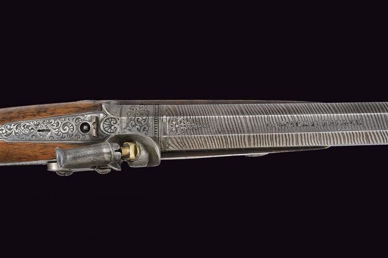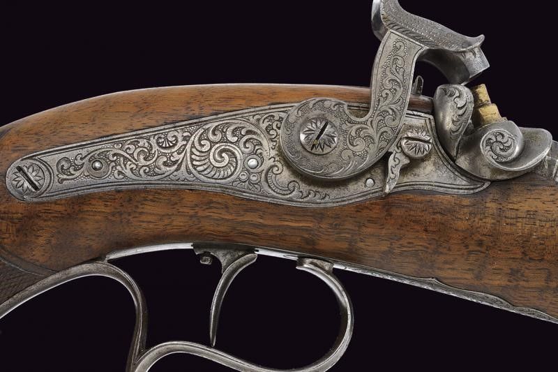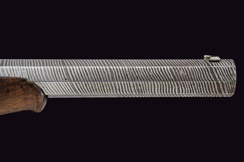 lunghezza 37 cm. Canna ottagonale, rigata (anima con leggero pitting, rigatura visibile), in damasco, finemente incisa alla base e con cornice e motivi floreali in argento, in seguito la firma 'G. NOACK IN BERLIN', mirino di precisione, cal. 10 mm. Codetta incisa a volute su fondo granulato e munita di alzo regolabile. Batteria a molla indietro incisa e munita di sicura. Mezza cassa in legno (piccolissimo restauro) con calcio zigrinato. Fornimenti in ferro decorati en suite. Stecher. Da cassetta, quindi priva di alloggiamento per la bacchetta.