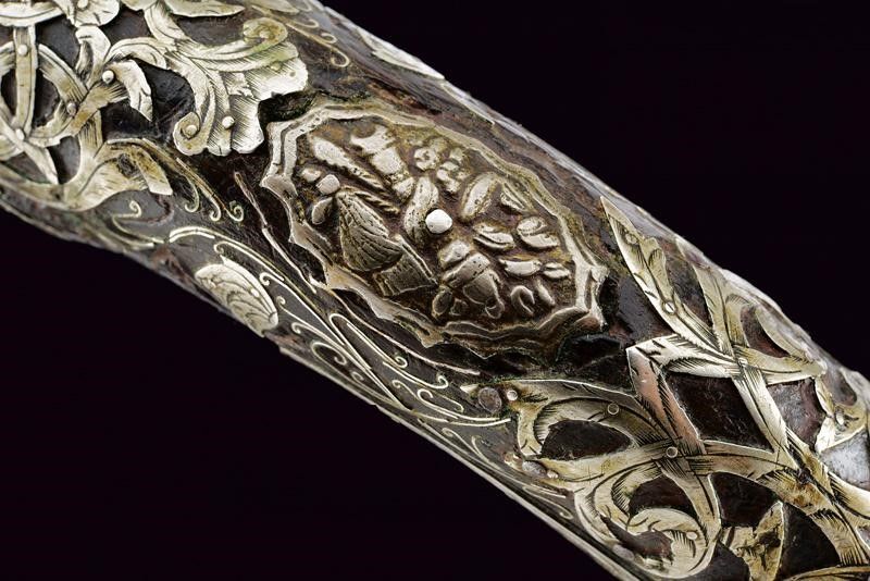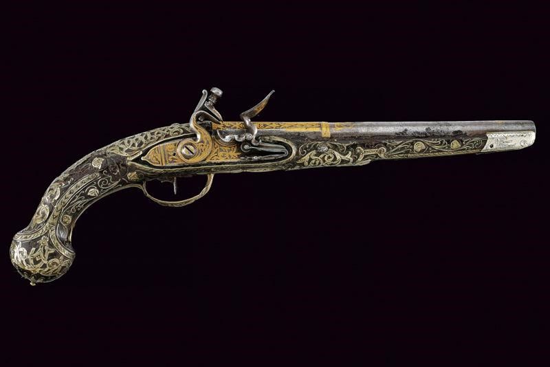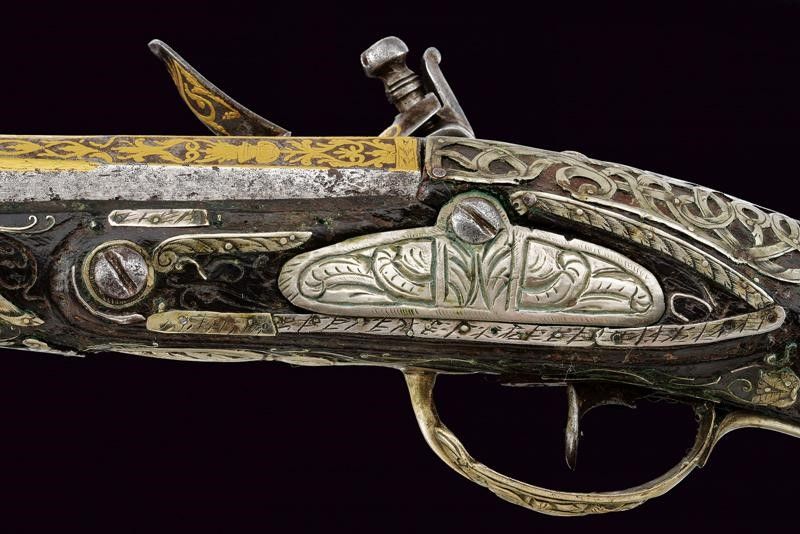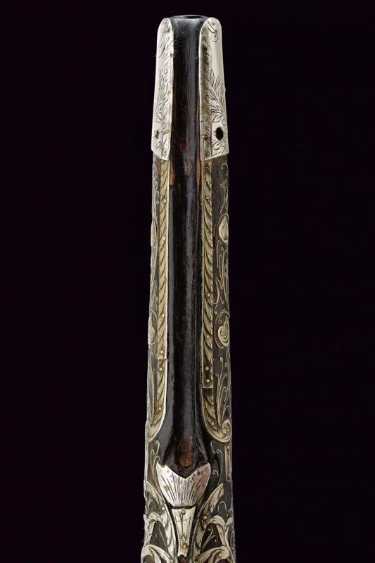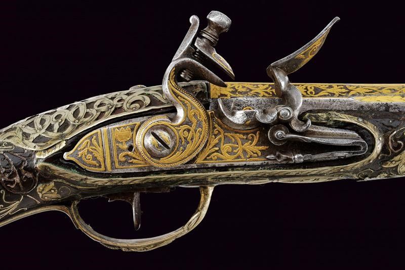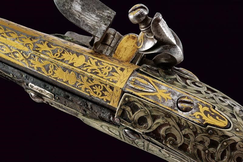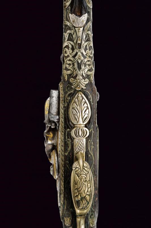 lunghezza 41.5 cm. Prima metà del XIX Secolo Canna liscia a due ordini, ottagonale nel primo segmento, poi tonda, riccamente decorata a motivi floreali in oro, cal. 14 mm. Codetta decorata in oro e munita di traguardo. Batteria decorata en suite, con sistema antifrizione e a tenuta stagna. Cassa intera in legno (piccole mancanze) decorata con tarsie in argento (varie mancanze). Fornimenti in argento incisi ed intagliati a trofei e a motivi floreali. La finta bacchetta mancante.